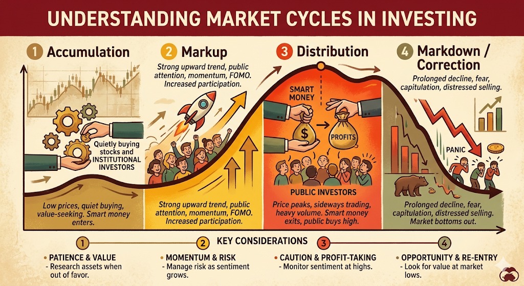 Understanding market cycles is essential for anyone looking to invest wisely and build long-term wealth. Financial markets do not move in a straight line—they go through phases of growth, peak, decline, and recovery. These cycles are influenced by factors such as economic conditions, interest rates, global events, and investor sentiment. Recognizing these patterns helps investors make more informed decisions rather than reacting emotionally to short-term market movements.