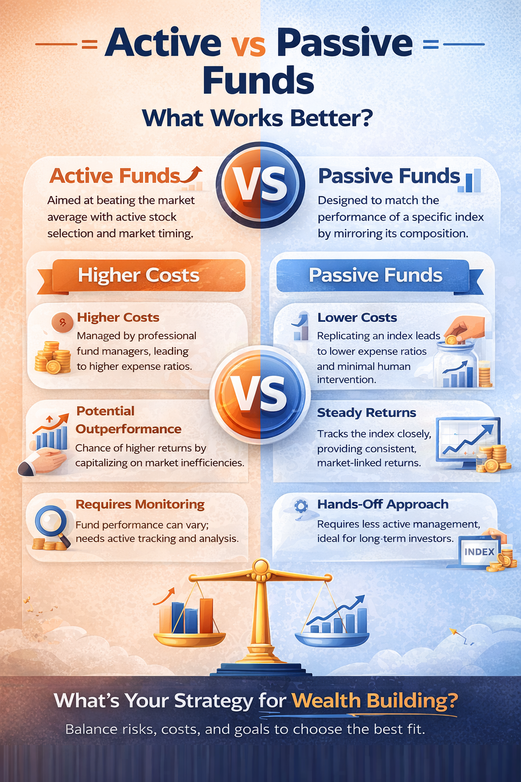 Choosing between active and passive funds ultimately depends on your investment goals, risk tolerance, and belief in market efficiency. If you seek the possibility of higher returns and are comfortable with some level of risk and cost, active funds may suit you. However, if you value simplicity, consistency, and lower expenses, passive funds can be a reliable option. A balanced approach, combining both strategies, can also help investors enjoy the best of both worlds while building a resilient portfolio over time.