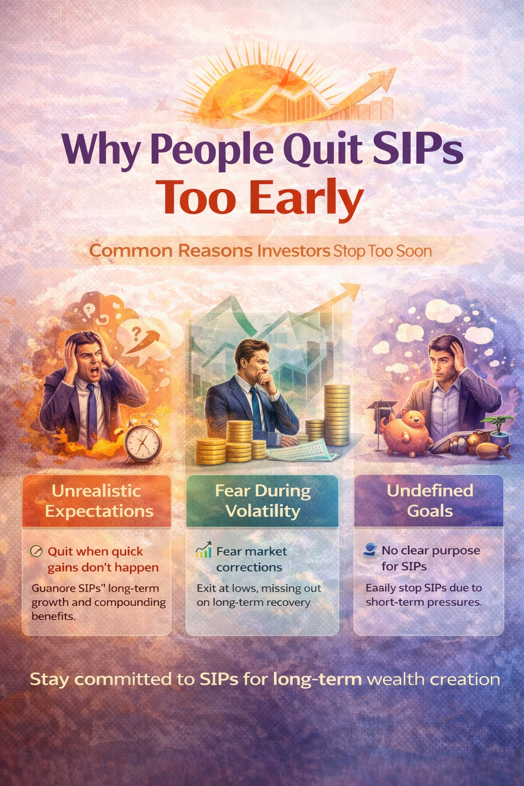 Systematic Investment Plans (SIPs) are designed to build wealth through discipline and consistency, yet many investors quit them too early—often just when they should stay invested the most. One of the primary reasons is unrealistic expectations. Investors enter SIPs hoping for quick returns, and when markets don’t deliver immediate gains, they lose confidence and stop investing. However, SIPs are meant for long-term growth, where the true power lies in compounding and rupee cost averaging over time.