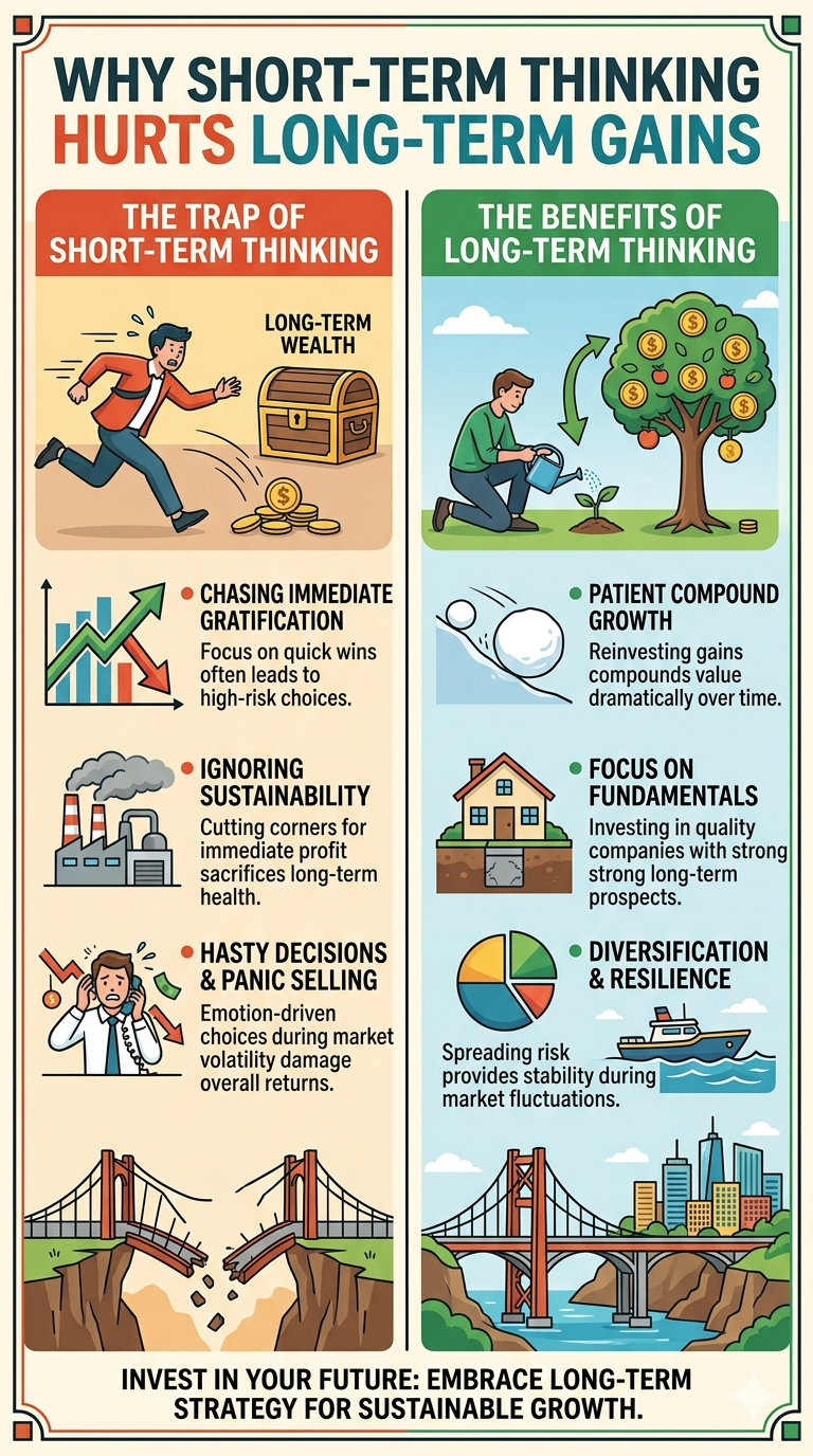 Another drawback of short-term thinking is frequent buying and selling, which can increase transaction costs and reduce net returns over time. It also prevents investors from fully benefiting from compounding, where returns generate additional returns. Missing even a few strong market recovery phases can have a significant impact on overall portfolio growth, making consistency far more important than timing.