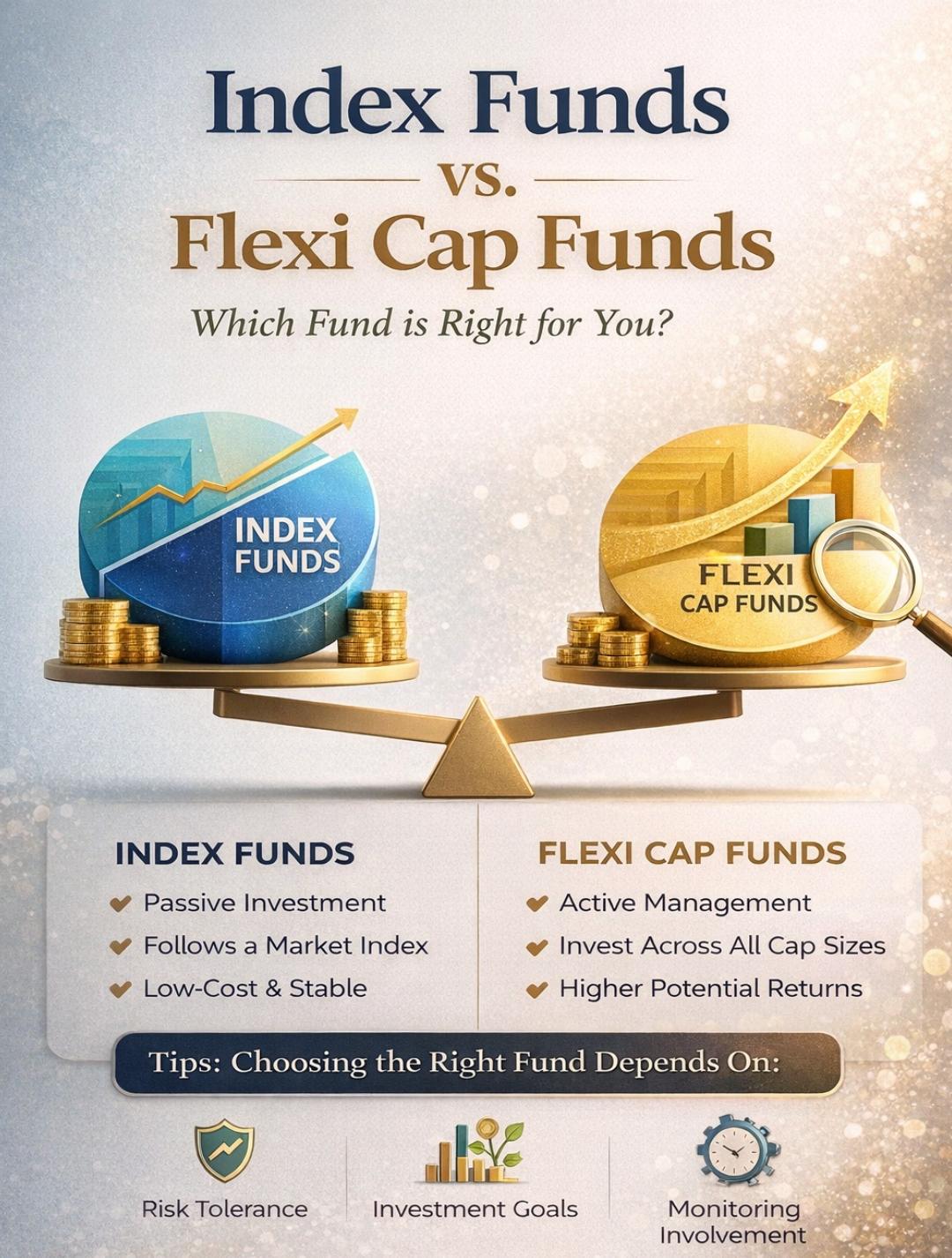 The key difference lies in how returns are generated. Index funds depend on overall market performance, meaning they will rise and fall with the index they track. They are ideal for investors who prefer a low-cost, long-term, and relatively predictable strategy. Flexi cap funds, however, aim to outperform the market by actively selecting stocks and shifting between market segments. This flexibility can potentially deliver higher returns, especially during dynamic market conditions, but it also comes with higher risk and slightly higher costs due to active management.